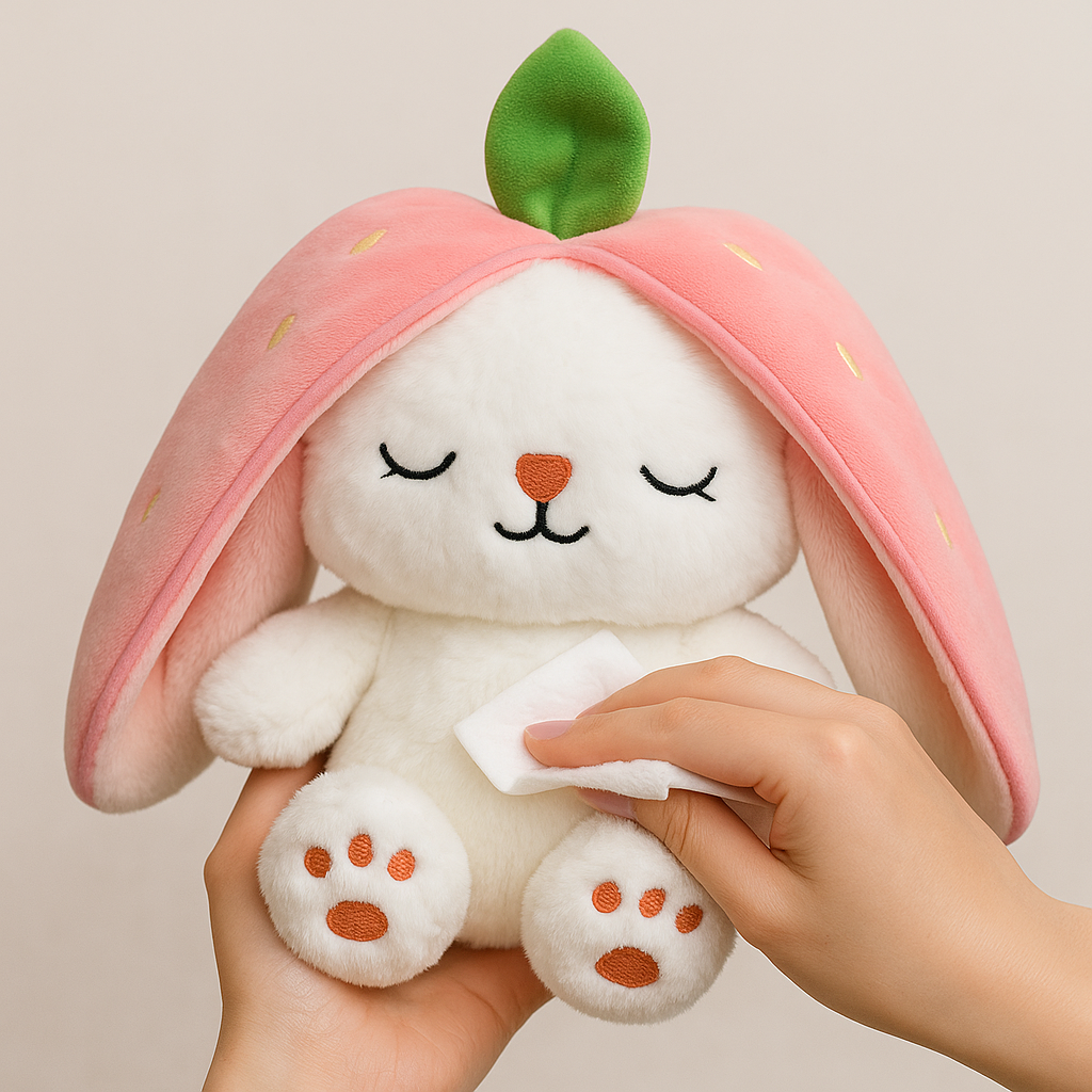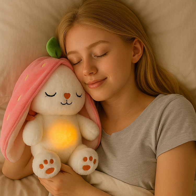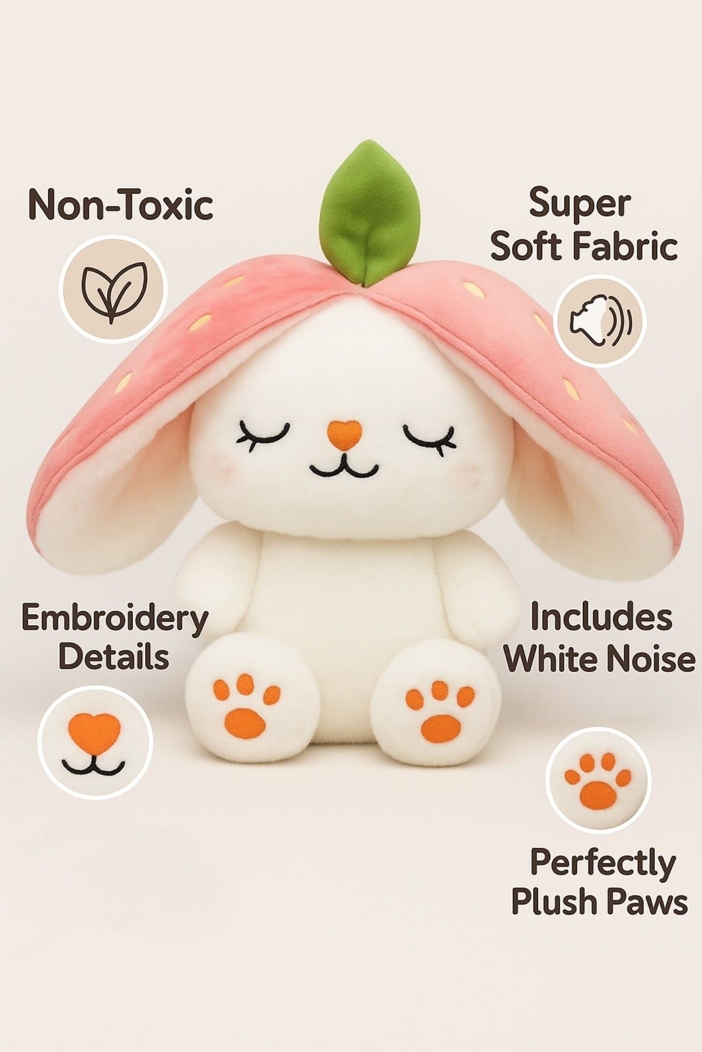 Wrapped in a soft strawberry hood, this adorable bunny rises and falls gently with a glowing, warm light that mimics real breathing. Perfect for bedtime, naps, and emotional comfort.