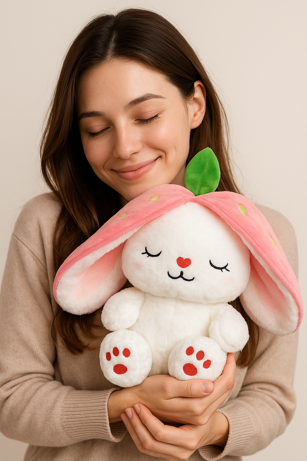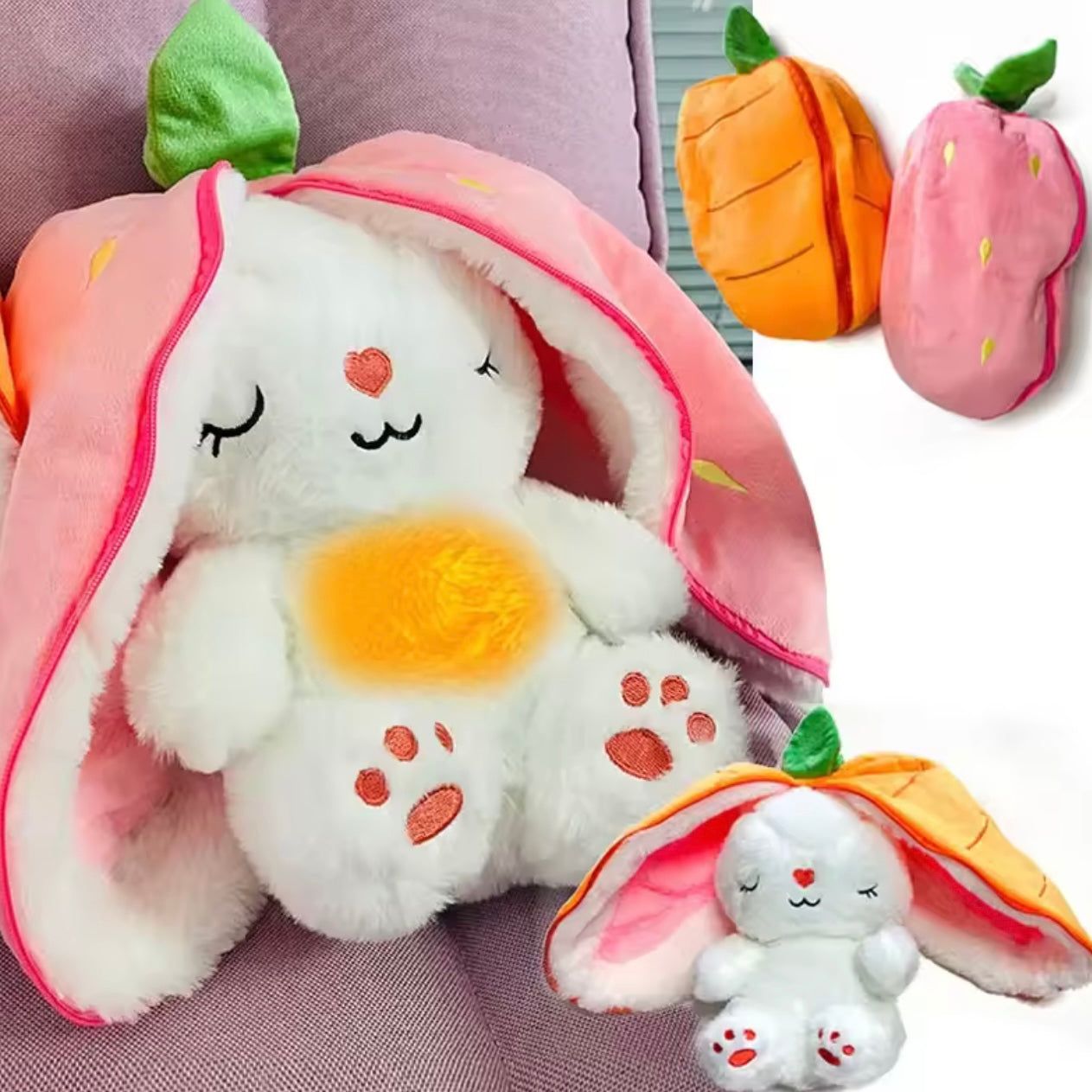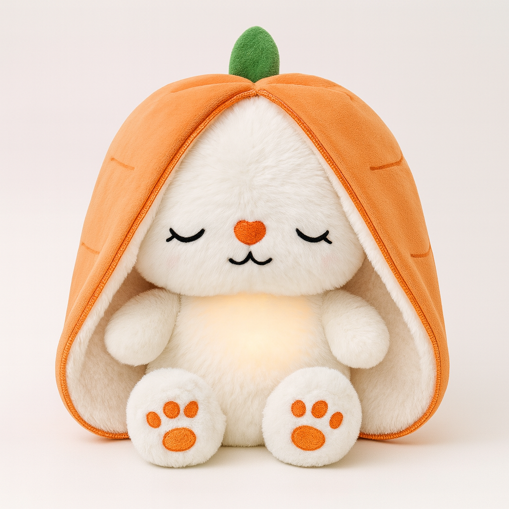 Wrapped in a soft strawberry hood, this adorable bunny rises and falls gently with a glowing, warm light that mimics real breathing. Perfect for bedtime, naps, and emotional comfort.