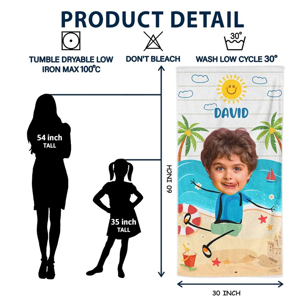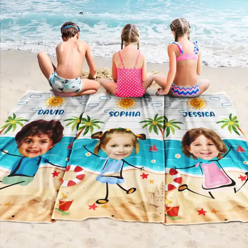 This large, high-quality custom beach towel is made from a soft, absorbent, and fast-drying cotton/poly blend—perfect for kids at the beach, spa, or home 🏠.