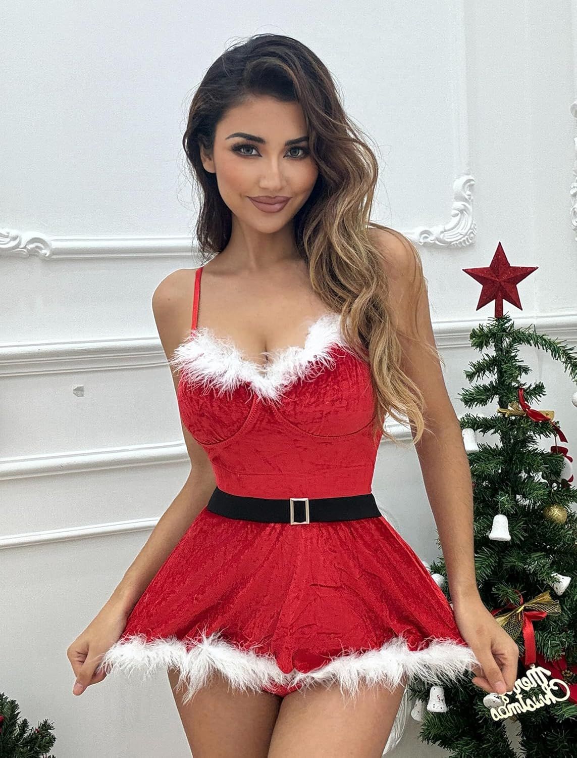 - 🌲Featured: This Christmas lingerie dress is designed with a furry fur trimmed V-neck to show off your hot chest curves, super cute christmas lingerie dress with black pull through adjustable belts, you'll look sexy and cute in it!