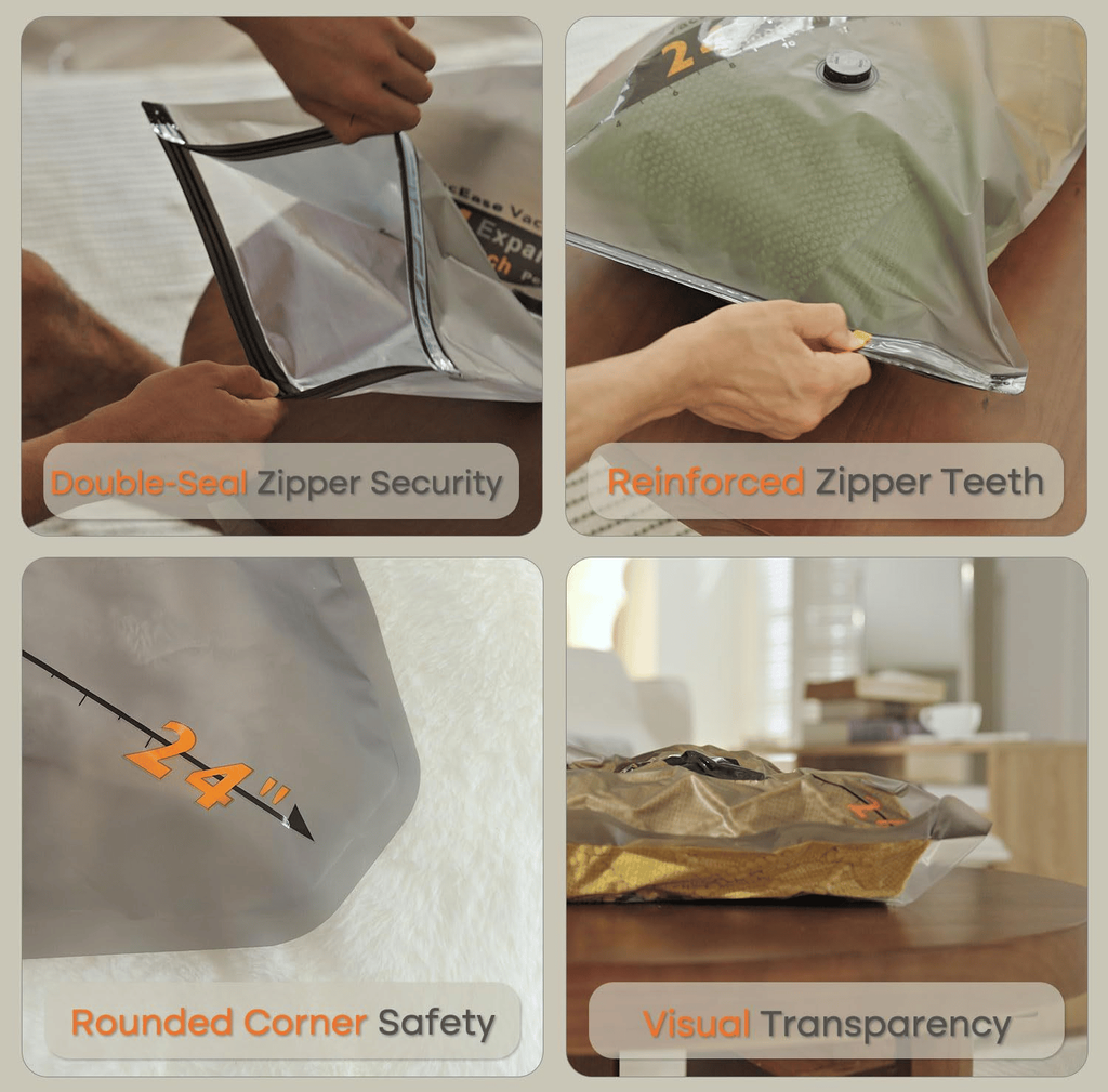 Includes small, medium, and large bags to fit everything from socks to sweaters. The wide-open design makes filling easy, while the secure seal protects your items from dust, moisture, and wrinkles. 🧦🧥🧤