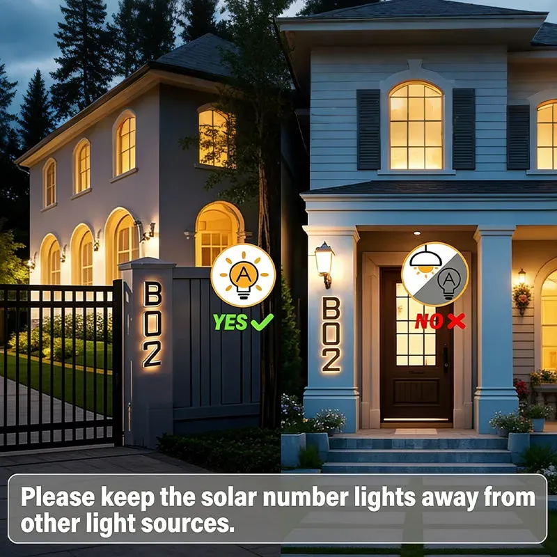 9-inch solar-powered LED house number light with a high-efficiency solar panel and built-in 1500mAh battery, charging automatically with no wiring. Ensuring your address is highly visible from a distance—so visitors, delivery drivers, and emergency services can find your home instantly.